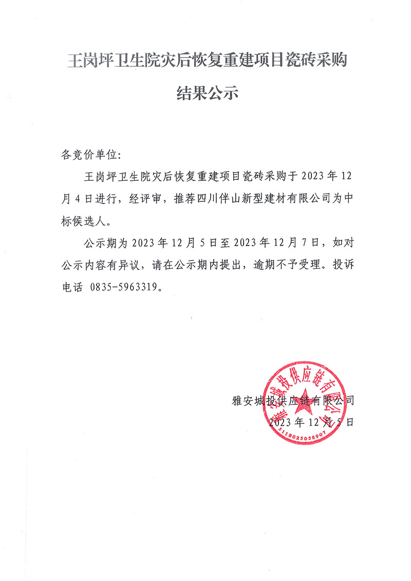 王崗坪衛(wèi)生院災(zāi)后恢復(fù)重建項(xiàng)目瓷磚采購(gòu)結(jié)果公示