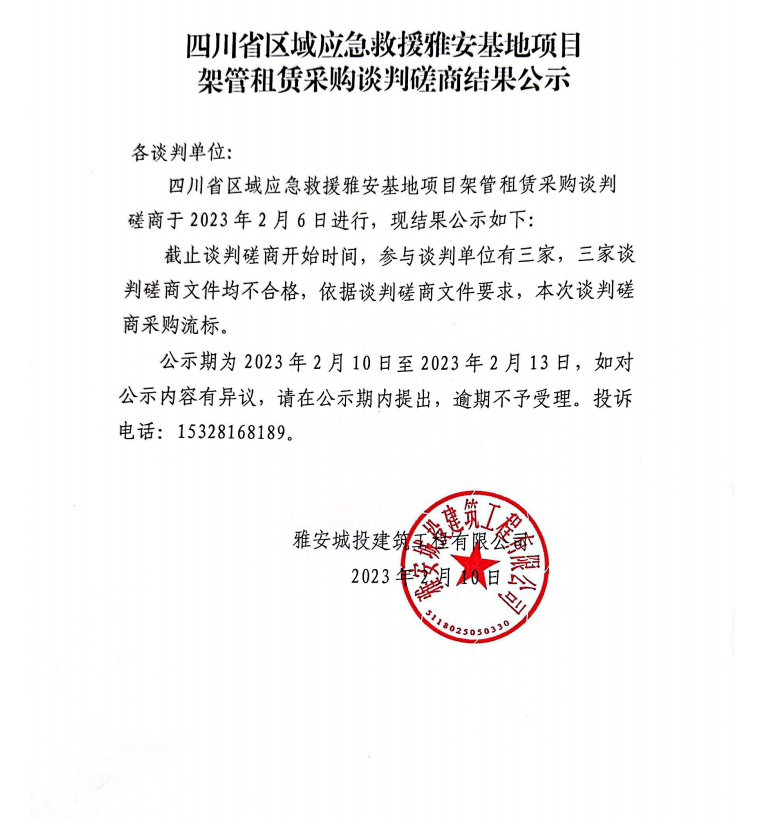 四川省區(qū)域應(yīng)急救援雅安基地項(xiàng)目架管租賃采購(gòu)談判磋商結(jié)果公示