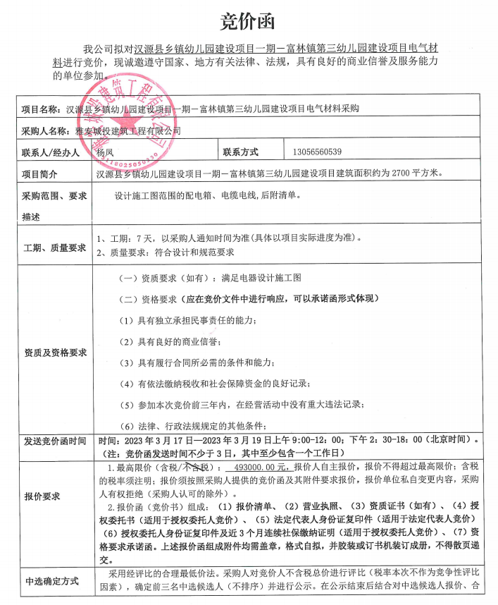 漢源縣鄉(xiāng)鎮(zhèn)幼兒園建設(shè)項(xiàng)目一期一富林鎮(zhèn)第三幼兒園建設(shè)項(xiàng)目電氣材料采購競(jìng)價(jià)公告