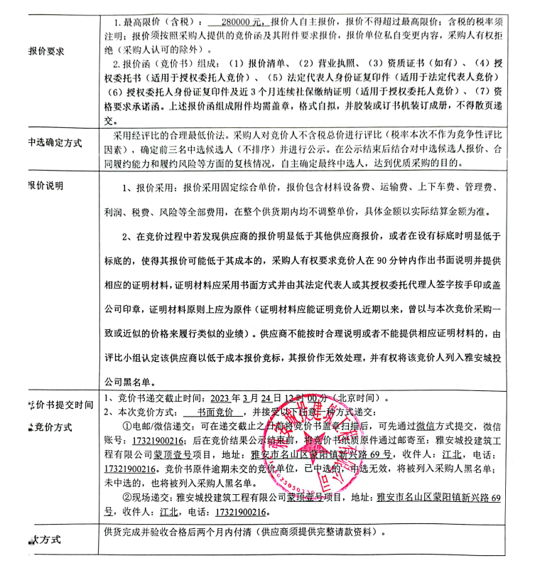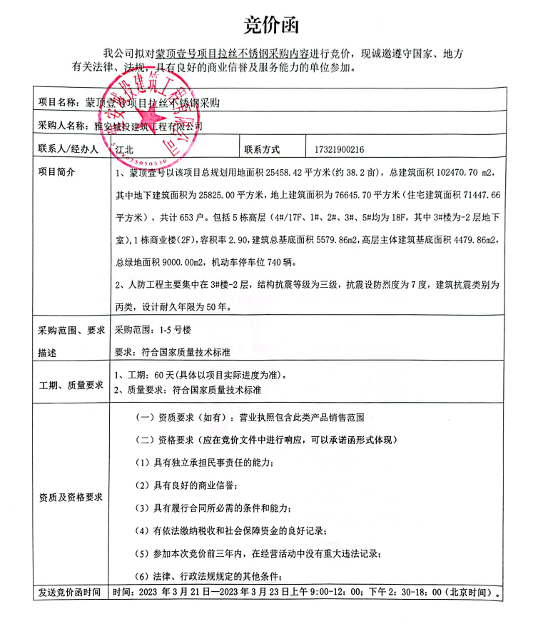 蒙頂壹號(hào)項(xiàng)目拉絲不銹鋼采購競(jìng)價(jià)公告