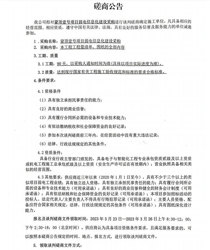 蒙頂壹號(hào)項(xiàng)目弱電信息化建設(shè)采購(gòu)談判磋商公告