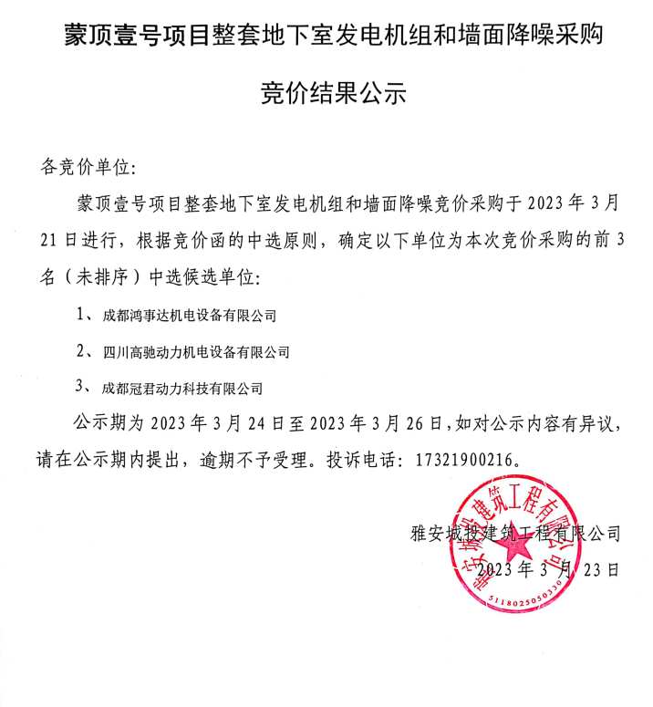 蒙頂壹號(hào)項(xiàng)目整套地下室發(fā)電機(jī)組和墻面降噪采購競價(jià)結(jié)果公示