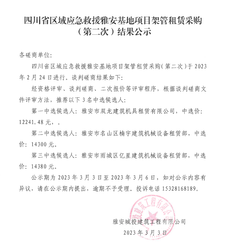 四川省區(qū)域應(yīng)急救援雅安基地項(xiàng)目架管租賃采購(第二次)結(jié)果公示