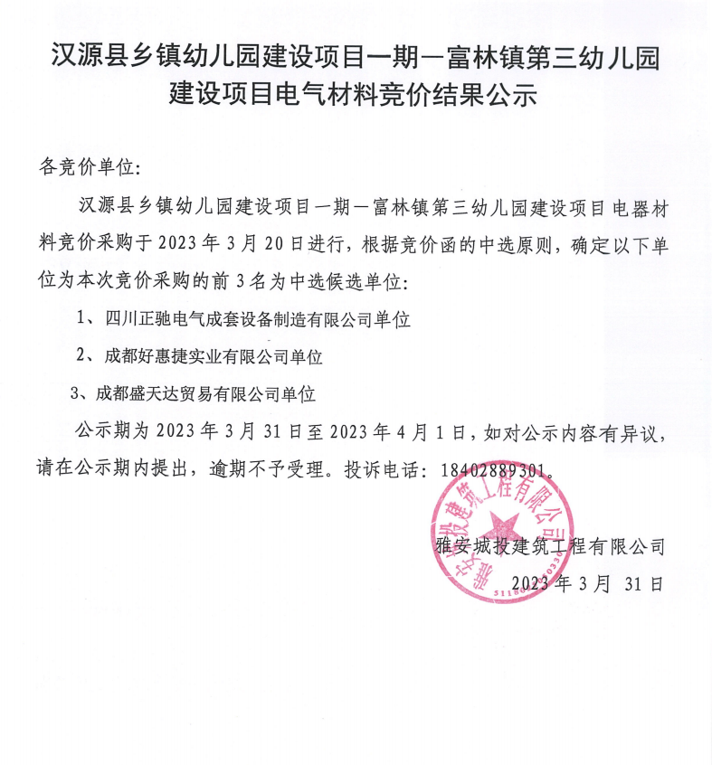 漢源縣鄉(xiāng)鎮(zhèn)幼兒園建設項目一期一富林鎮(zhèn)第三幼兒園建設項目電氣材料競價結(jié)果公示