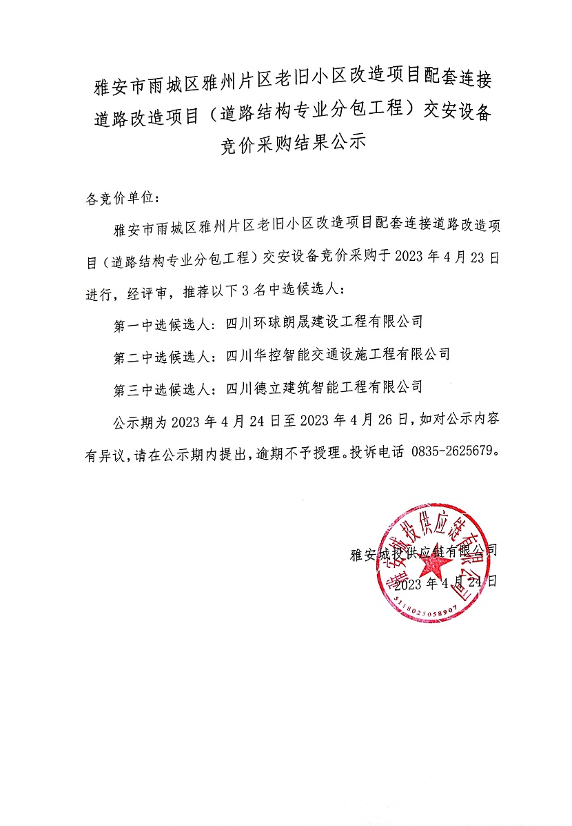 雅安市雨城區(qū)雅州片區(qū)老舊小區(qū)改造項目配套連接道路改造項目(道路結(jié)構(gòu)專業(yè)分包工程)交安設備競價采購結(jié)果公示