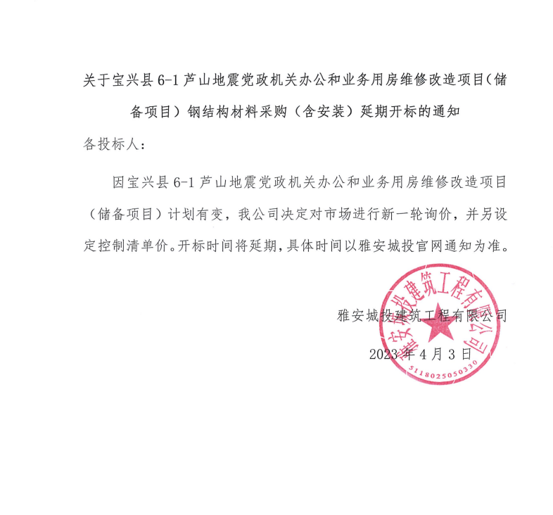 關(guān)于寶興縣6-1蘆山地震黨政機關(guān)辦公和業(yè)務(wù)用房維修改造項目(儲備項目)鋼結(jié)構(gòu)材料采購(含安裝)延期開標(biāo)的通知