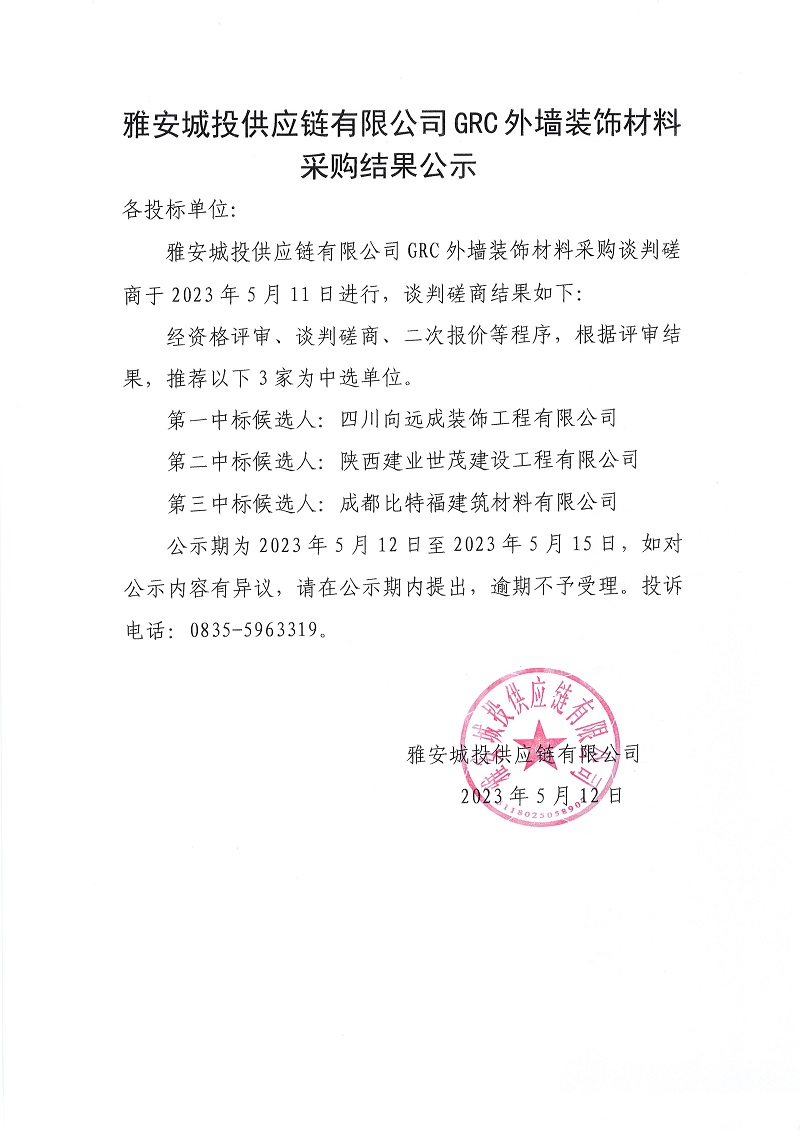 雅安城投供應鏈有限公司GRC外墻裝飾材料采購結果公示
