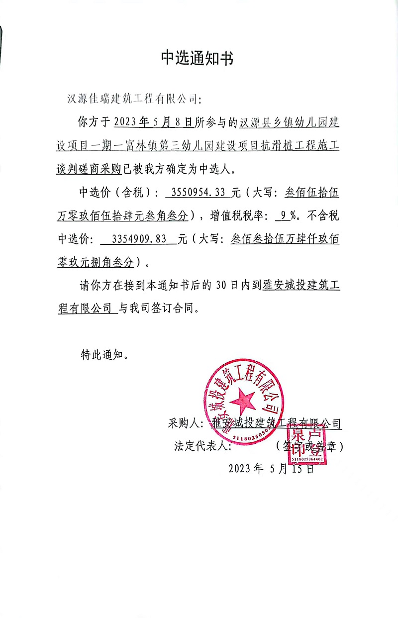 漢源縣鄉(xiāng)鎮(zhèn)幼兒園建設(shè)項(xiàng)目一期一富林鎮(zhèn)第三幼兒園建設(shè)項(xiàng)目抗滑樁工程施工談判磋商采購中選通知書