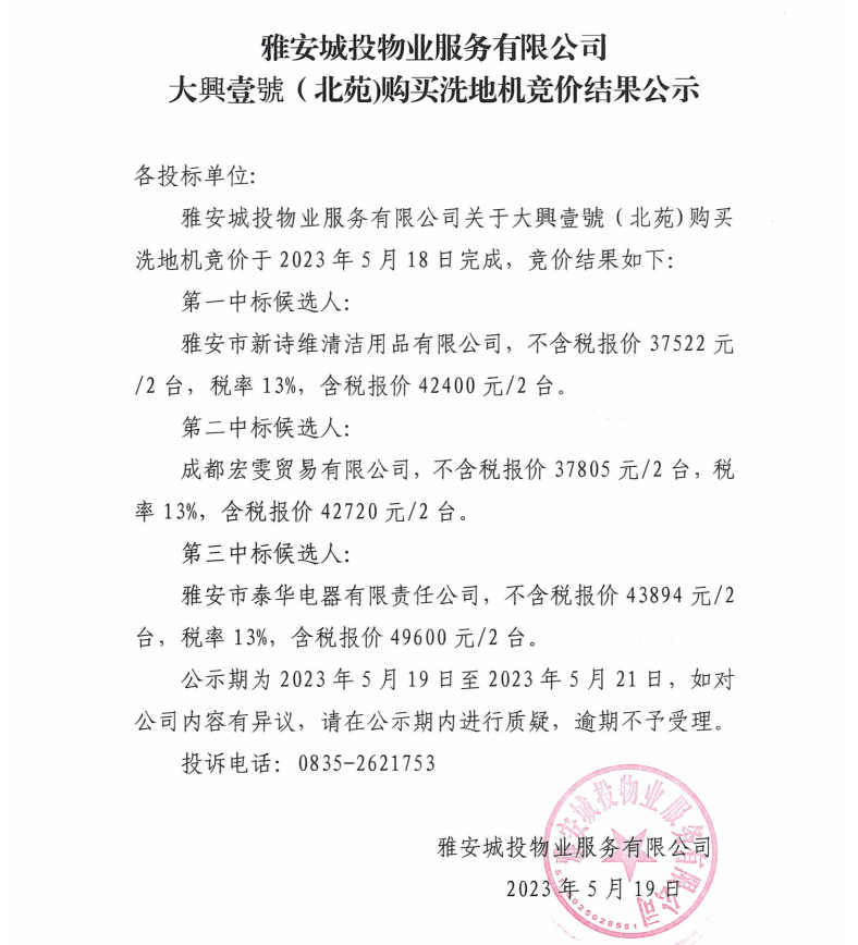 雅安城投物業(yè)服務(wù)有限公司大興壹號(北苑)購買洗地機(jī)競價結(jié)果公示