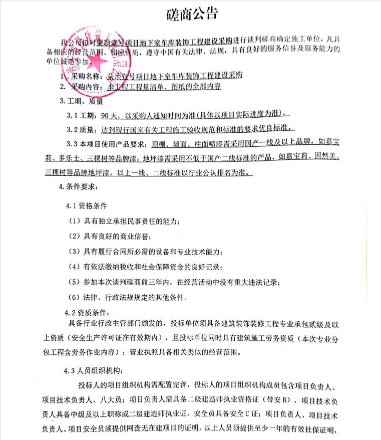 蒙頂壹號項目地下室車庫裝飾工程建設采購談判磋商公告