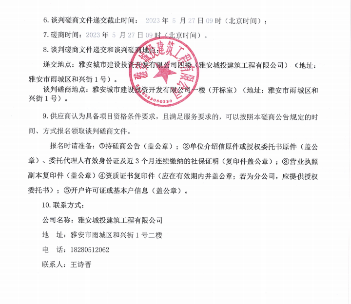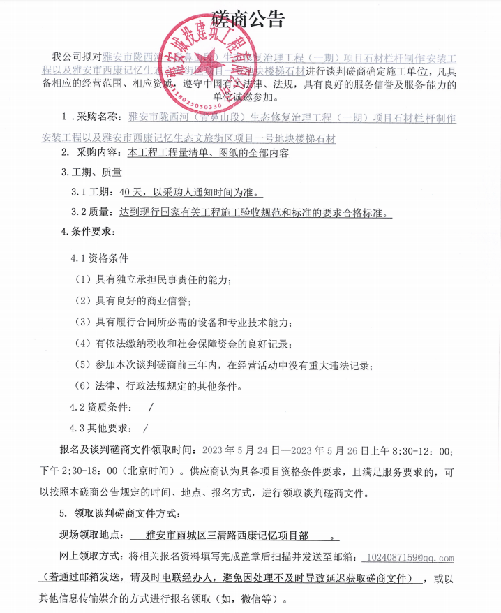 雅安市隴西河(青鼻山段)生態(tài)修復(fù)治理工程(一期)項(xiàng)目石材欄桿制作安裝工程以及雅安市西康記憶生態(tài)文旅街區(qū)項(xiàng)目一號地塊樓梯石材談判磋商公告