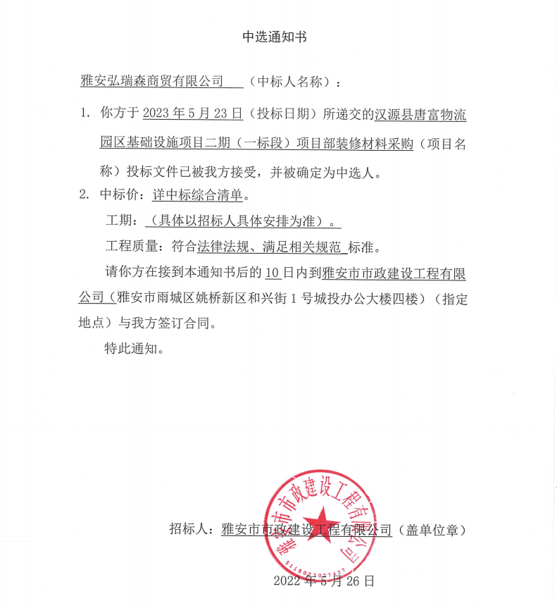 漢源縣唐富物流園區(qū)基礎(chǔ)設(shè)施項(xiàng)目二期(一標(biāo)段)項(xiàng)目部裝修材料采購(gòu)中選通知書