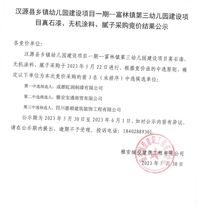 漢源縣鄉(xiāng)鎮(zhèn)幼兒園建設(shè)項(xiàng)目一期--富林鎮(zhèn)第三幼兒園建設(shè)項(xiàng)目真石漆、無(wú)機(jī)涂料、膩?zhàn)硬少?gòu)競(jìng)價(jià)結(jié)果公示