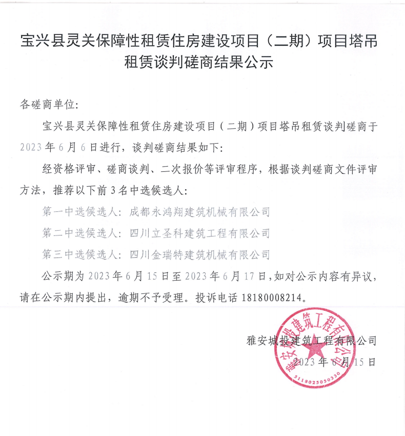 寶興縣靈關(guān)保障性租賃住房建設(shè)項(xiàng)目(二期)項(xiàng)目塔吊租賃談判磋商競價(jià)結(jié)果公示