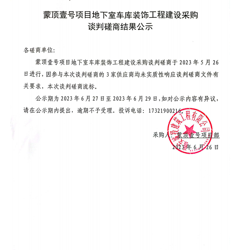 蒙頂壹號項目地下室車庫裝飾工程建設(shè)采購談判磋商結(jié)果公示