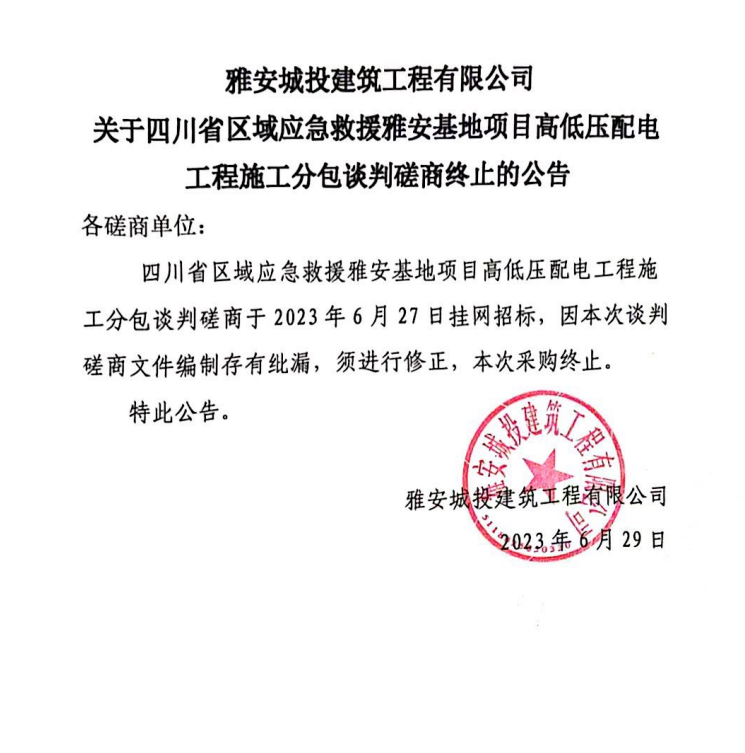 雅安城投建筑工程有限公司關(guān)于四川省區(qū)域應(yīng)急救援雅安基地項目高低壓配電工程施工分包談判磋商終止的公告