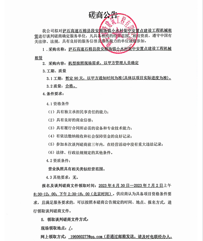 瀘石高速石棉縣段安順場鎮(zhèn)小水村集中安置點建設(shè)工程機(jī)械租賃談判磋商公告