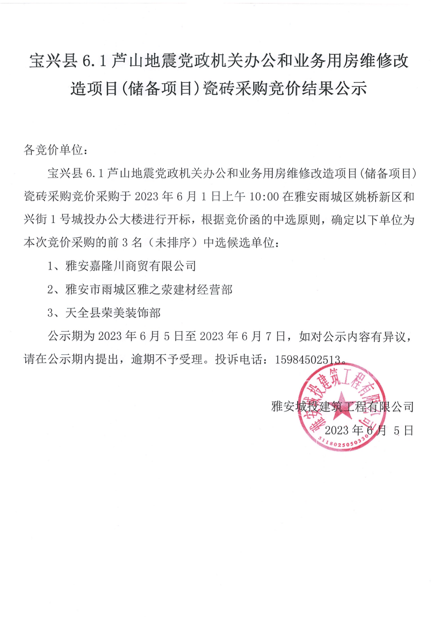寶興縣6.1蘆山地震黨政機(jī)關(guān)辦公和業(yè)務(wù)用房維修改造項目(儲備項目)瓷磚采購競價結(jié)果公示
