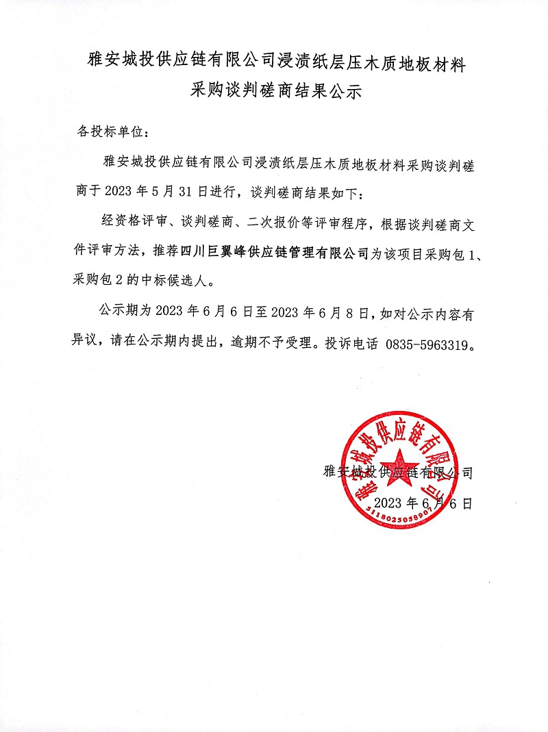 雅安城投供應(yīng)鏈有限公司浸漬紙層壓木質(zhì)地板材料采購談判磋商結(jié)果公示
