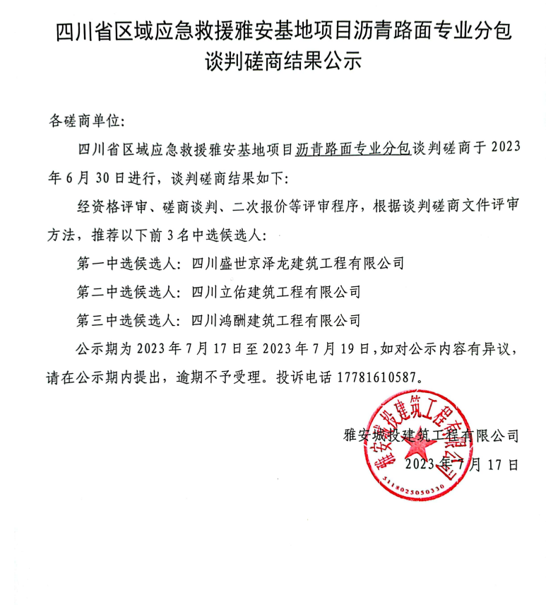 四川省區(qū)域應(yīng)急救援雅安基地項目瀝青路面專業(yè)分包談判磋商結(jié)果公示