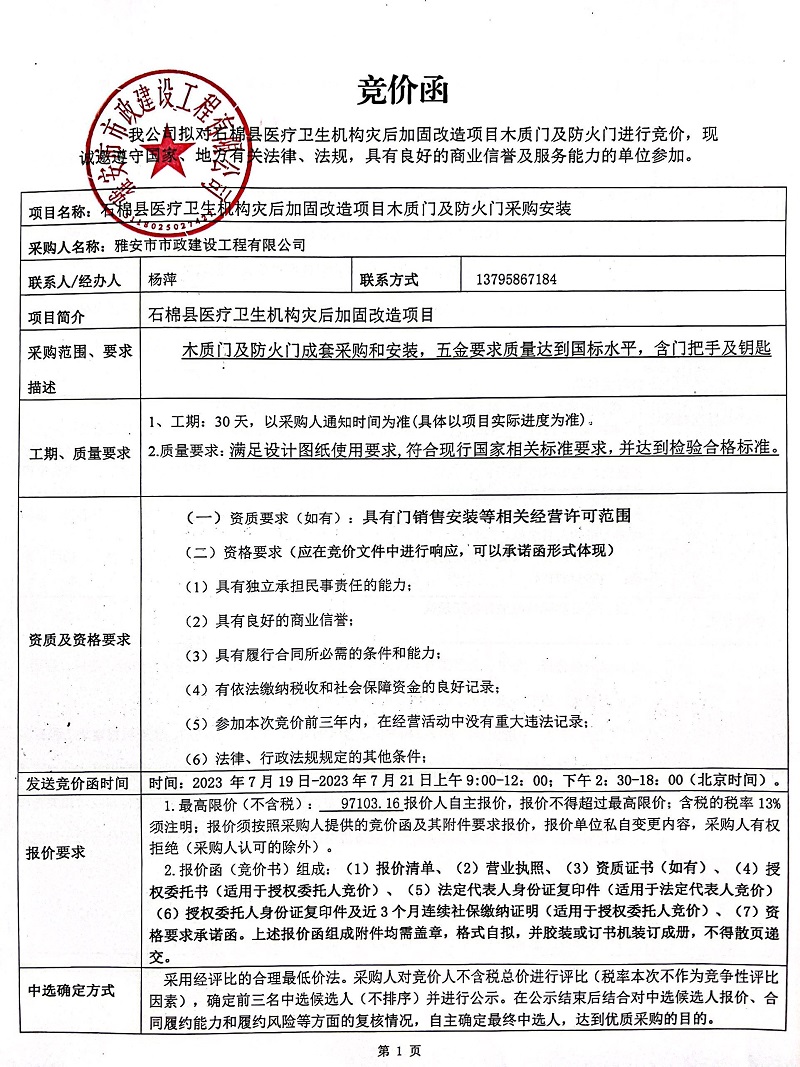 石棉縣醫(yī)療衛(wèi)生機(jī)構(gòu)災(zāi)后加固改造項(xiàng)目木質(zhì)門(mén)及防火門(mén)采購(gòu)安裝競(jìng)價(jià)公告