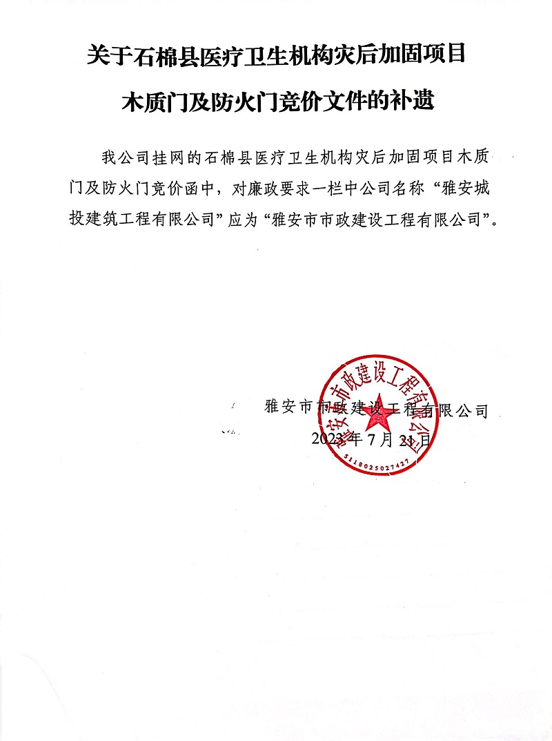 關(guān)于石棉縣醫(yī)療衛(wèi)生機(jī)構(gòu)災(zāi)后加固項目木質(zhì)門及防火門競價文件的補(bǔ)遺