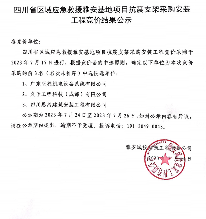 四川省區(qū)域應(yīng)急救援雅安基地項(xiàng)目抗震支架采購安裝工程競價結(jié)果公示