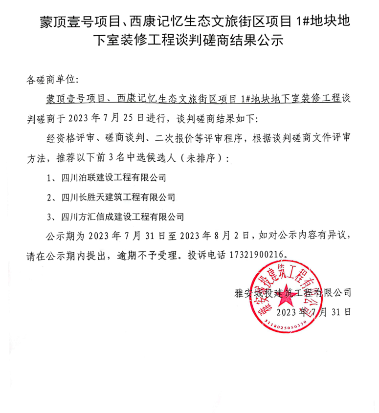 蒙頂壹號(hào)項(xiàng)目、西康記憶生態(tài)文旅街區(qū)項(xiàng)目1#地塊地下室裝修工程談判磋商結(jié)果公示