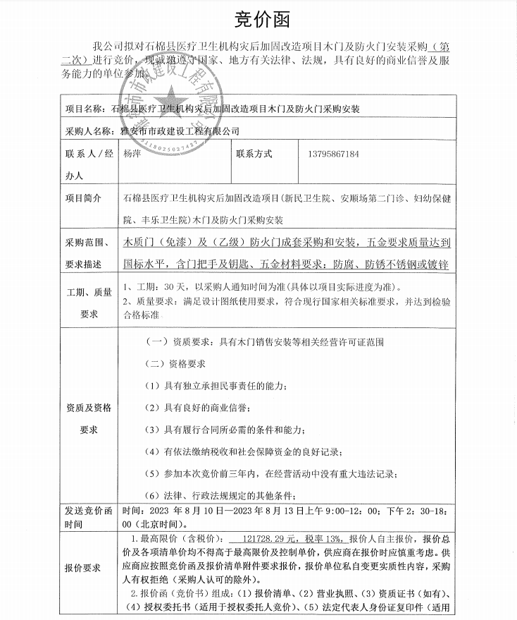 石棉縣醫(yī)療衛(wèi)生機(jī)構(gòu)災(zāi)后加固改造項(xiàng)目木門(mén)及防火門(mén)安裝采購(gòu)(第二次)競(jìng)價(jià)公告