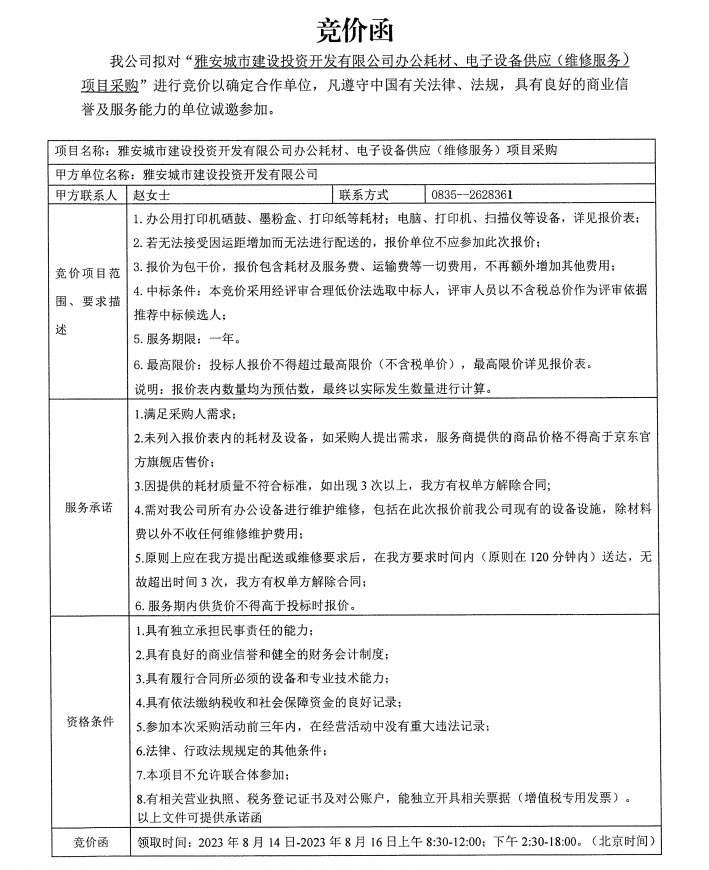 雅安城市建設(shè)投資開發(fā)有限公司辦公耗材、電子設(shè)備供應(yīng)(維修服務(wù))項目采購競價公告