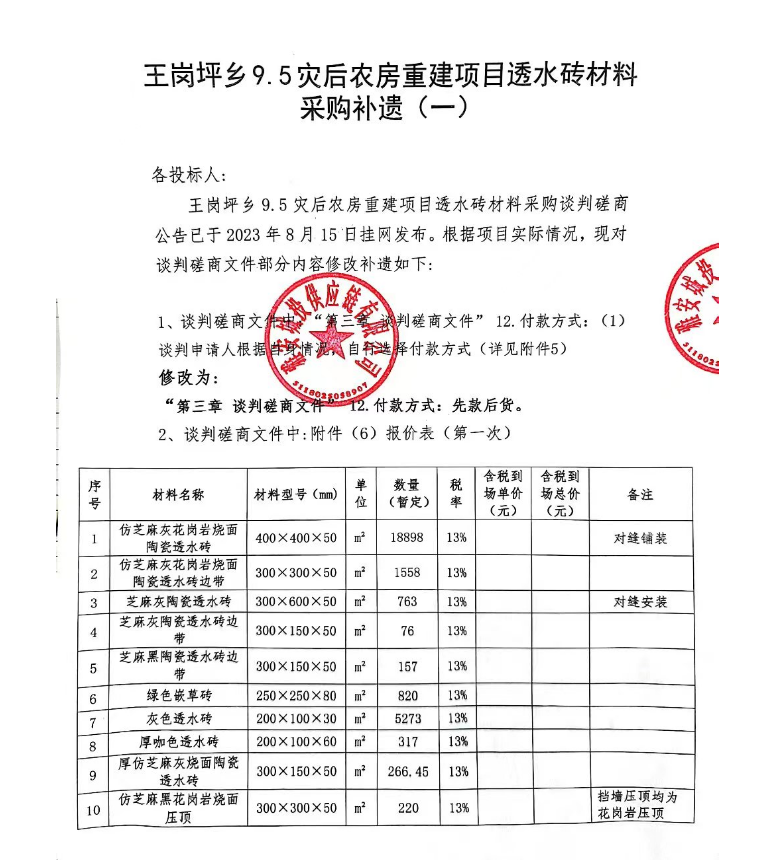 王崗坪鄉(xiāng)9.5災(zāi)后農(nóng)房重建項目透水磚材料采購補遺(一)