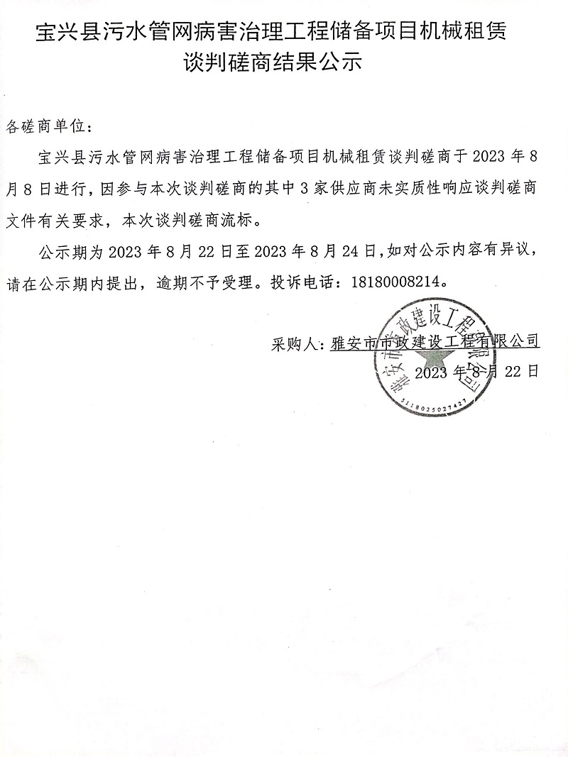 寶興縣污水管網(wǎng)病害治理工程儲備項目機(jī)械租賃談判磋商結(jié)果公示