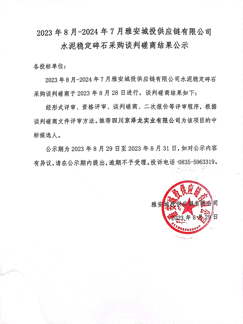 2023年8月-2024年7月雅安城投供應鏈有限公司水泥穩(wěn)定碎石采購談判磋商結果公示