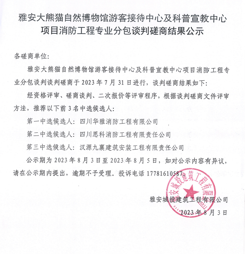 雅安大熊貓自然博物館游客接待中心及科普宣教中心項(xiàng)目消防工程專業(yè)分包談判磋商結(jié)果公示