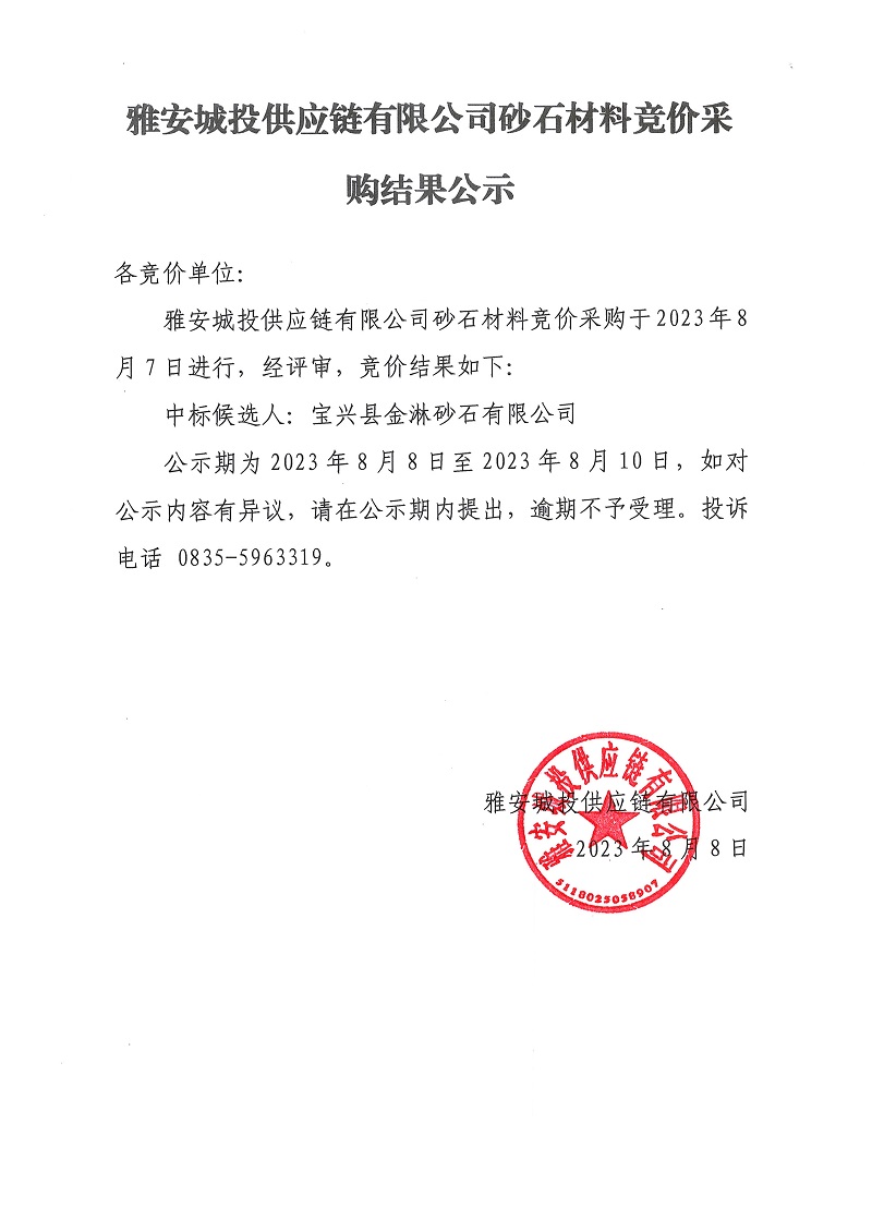 雅安城投供應鏈有限公司砂石材料競價采購結果公示