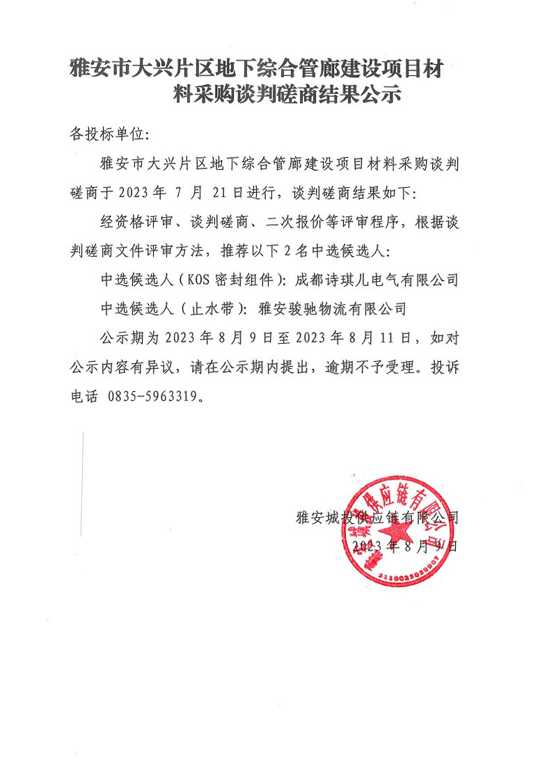 雅安市大興片區(qū)地下綜合管廊建設(shè)項目材料采購談判磋商結(jié)果公示