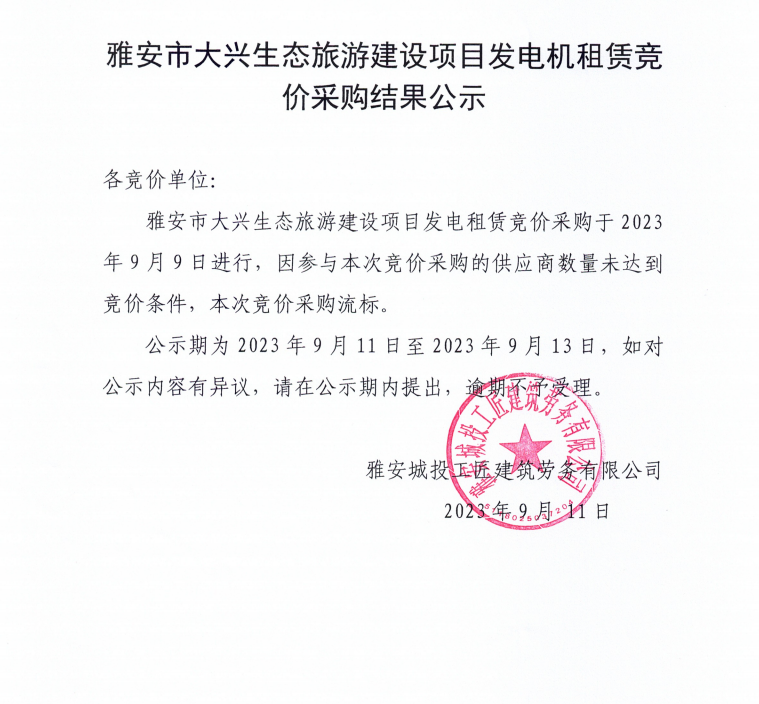 雅安市大興生態(tài)旅游建設(shè)項(xiàng)目發(fā)電機(jī)租賃競價(jià)采購結(jié)果公示