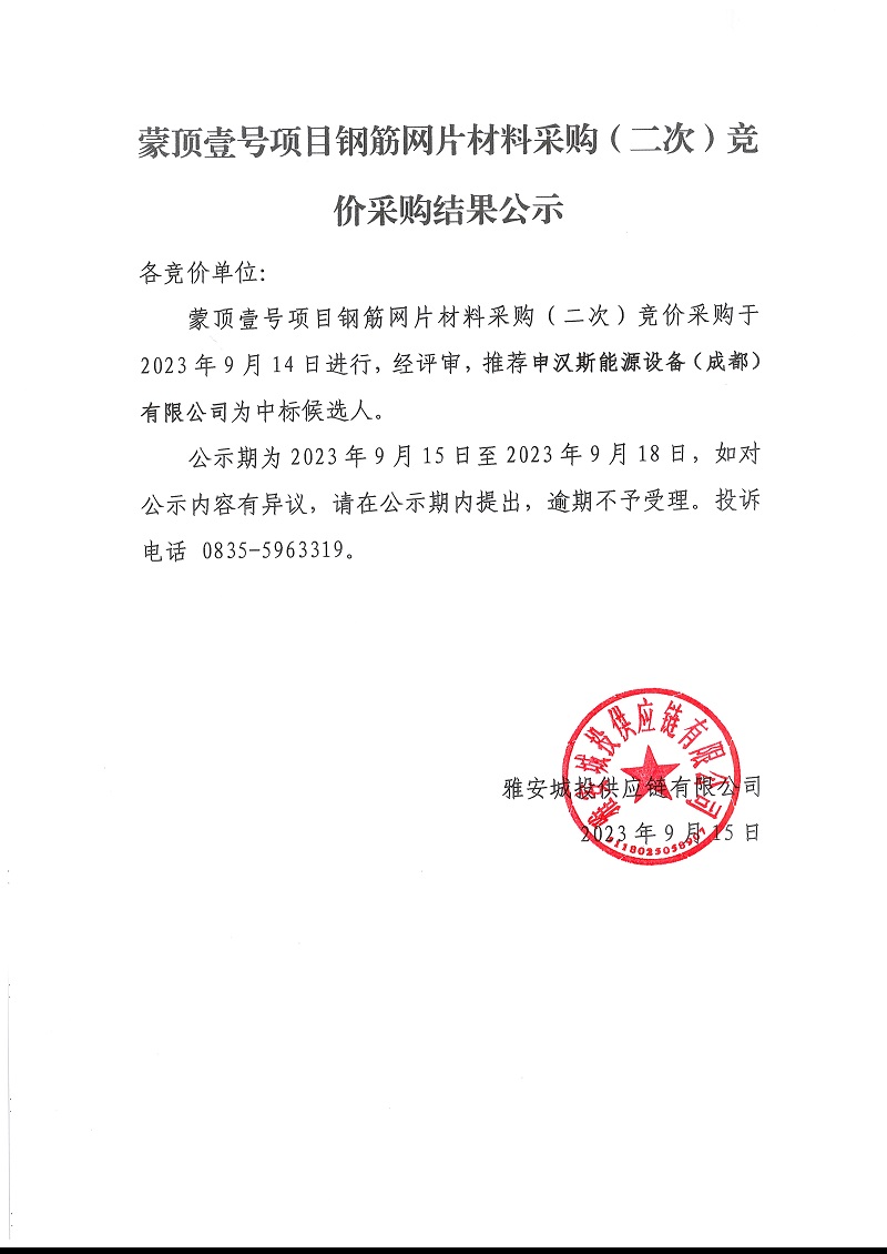 蒙頂壹號項目鋼筋網(wǎng)片材料采購(二次)競價采購結果公示