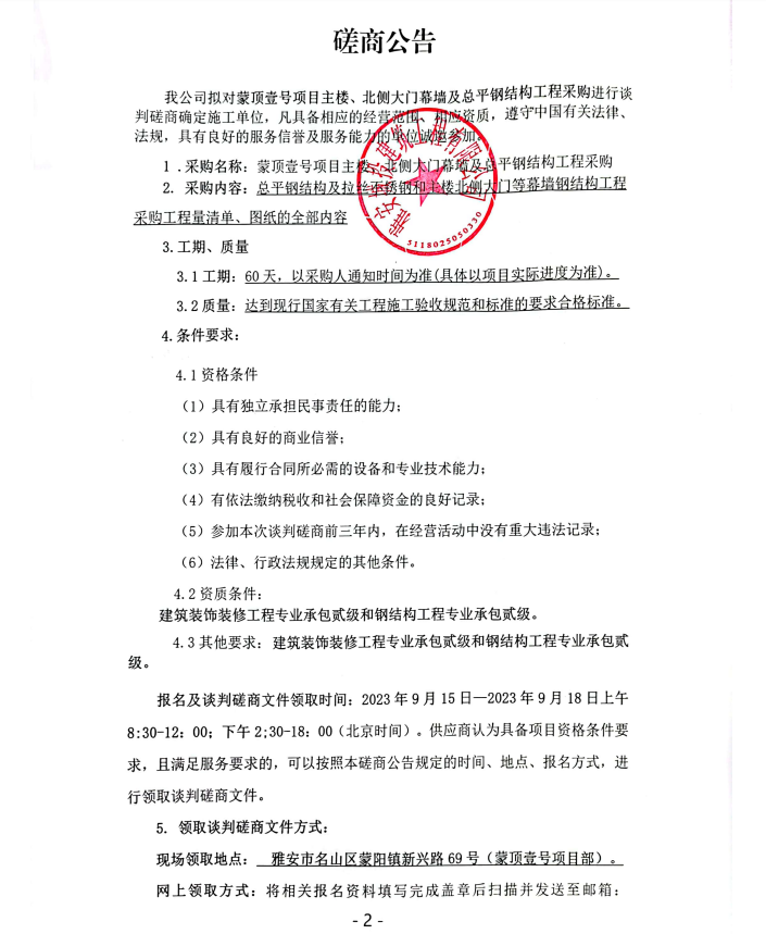 蒙頂壹號(hào)項(xiàng)目主樓、北側(cè)大門(mén)幕墻及總平鋼結(jié)構(gòu)工程采購(gòu)談判磋商公告