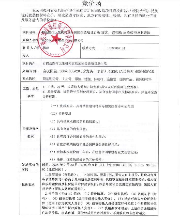 石棉縣醫(yī)療衛(wèi)生機(jī)構(gòu)災(zāi)后加固改造項(xiàng)目巖板面盆、A級(jí)防火鋁扣板及瓷磚膠材料采購(gòu)競(jìng)價(jià)公告