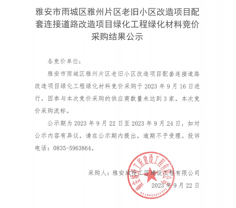 雅安市雨城區(qū)雅州片區(qū)老舊小區(qū)改造項(xiàng)目配套連接道路改造項(xiàng)目綠化工程綠化材料競(jìng)價(jià)采購結(jié)果公示