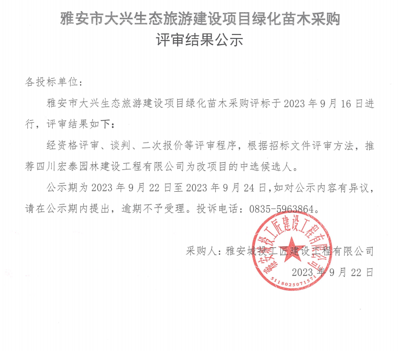 雅安市大興生態(tài)旅游建設(shè)項(xiàng)目綠化苗木采購評審結(jié)果公示