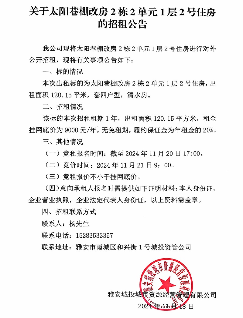關(guān)于太陽巷棚改房2棟2單元1層2號住房的招租公告