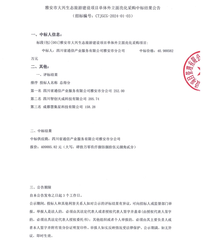 雅安市大興生態(tài)旅游建設(shè)項目單體外立面亮化采購中標結(jié)果公告