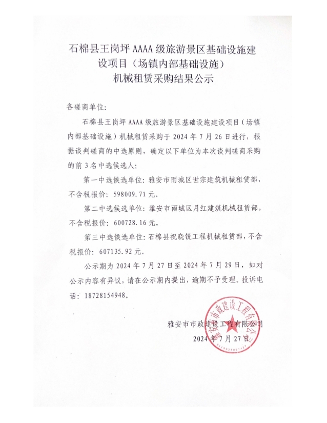 石棉縣王崗坪AAAA級旅游景區(qū)基礎設施建設項目(場鎮(zhèn)內(nèi)部基礎設施)機械租賃采購結果公示