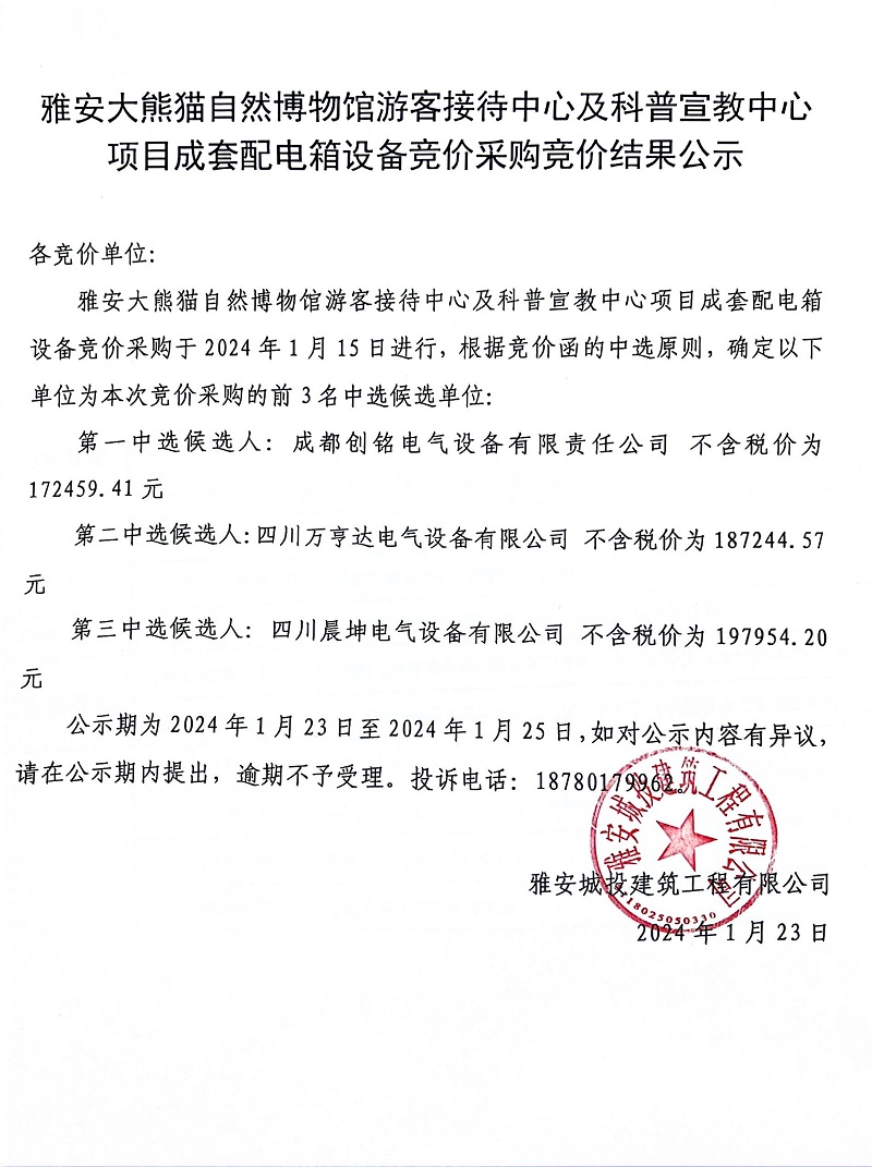 雅安大熊貓自然博物館游客接待中心及科普宣教中心項目成套配電箱設(shè)備競價采購競價結(jié)果公示