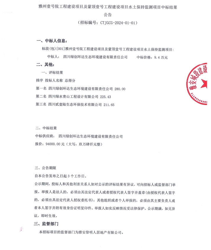 雅州壹號院工程建設(shè)項(xiàng)目及蒙頂壹號工程建設(shè)項(xiàng)目水土保持監(jiān)測項(xiàng)目中標(biāo)結(jié)果公告