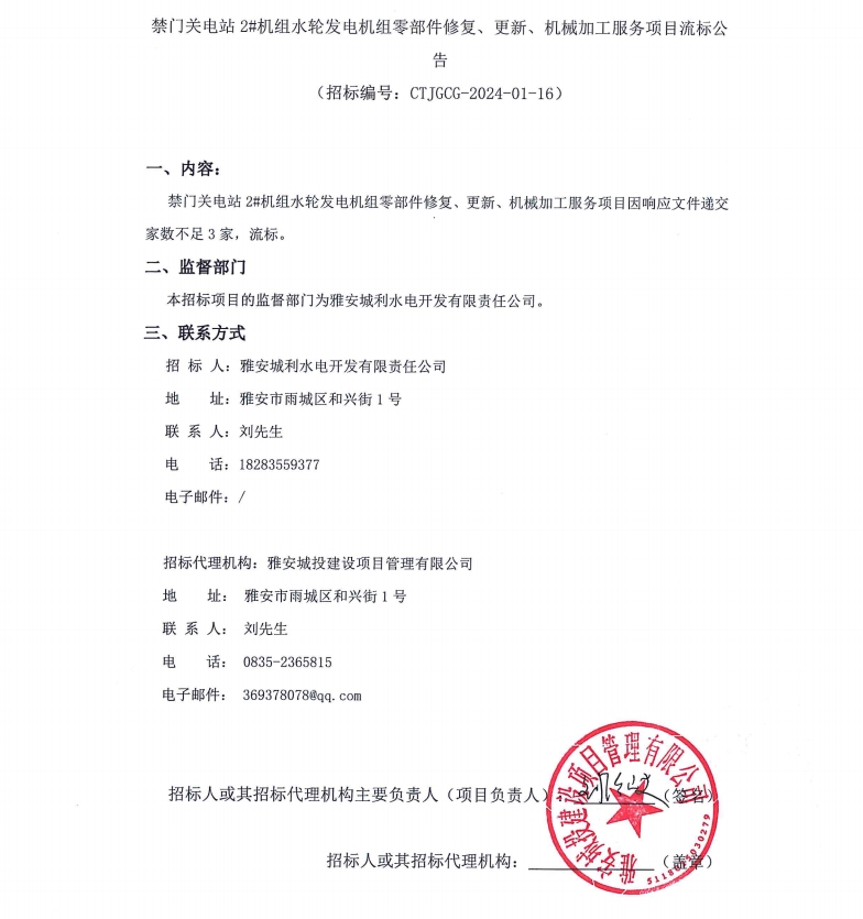 禁門關(guān)電站2#機(jī)組水輪發(fā)電機(jī)組零部件修復(fù)、更新、機(jī)械加工服務(wù)項(xiàng)目流標(biāo)公告