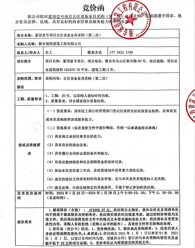 蒙頂壹號項(xiàng)目公區(qū)設(shè)備家具采購(第二次)競價公告