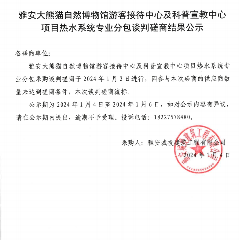 雅安大熊貓自然博物館游客接待中心及科普宣教中心項目熱水系統(tǒng)專業(yè)分包談判磋商結(jié)果公示